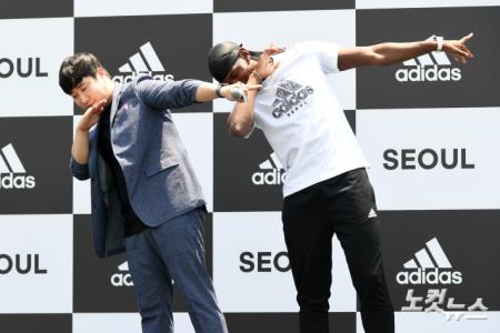 EPL 명문구단 맨체스터 유나이티드 활약하는 축구선수 폴 포그바가 13일 오후 서울 용산구 더베이스 풋살장에서 열린 미디어데이 행사에 참석해 배성재 아나운서와 세레머니를 하고 있다.
