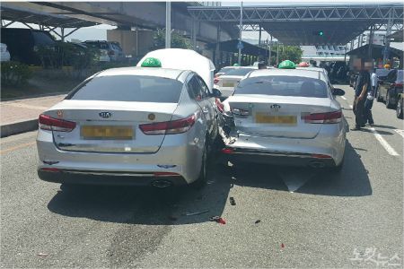 13일 오전 10시 25분쯤 부산 강서구 김해공항 국제선 택시 승가앙에서 A(73)씨의 K5 택시가 앞서 손님을 기다리던 또 다른 K5 택시를 들이받았다.