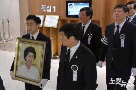 고 이희호 여사의 발인일인 14일 서울 연세대학교 장례식장에서 고인의 영정사진이 옮겨지고 있다.