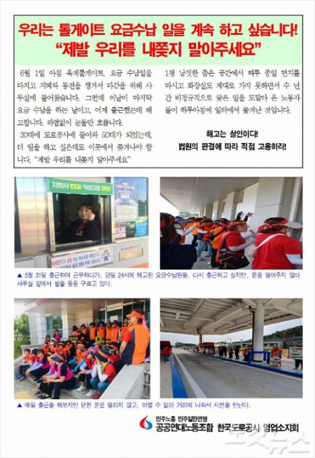 한편 공공연대노조 한국도로공사 영업소지회는 오는 22일 강릉 시내에서 대규모 결의대회를 개최할 예정이다.