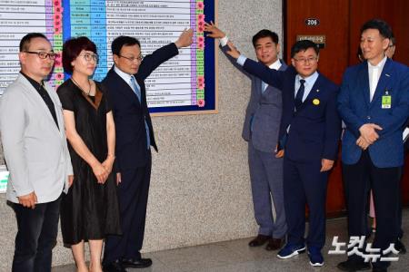 더불어민주당 이해찬 대표가 19일 오전 국회에서 열린 을지로위원회 상생꽃달기 행사에서 화장품 자영업 살리기에 앞장선 김병욱·김성환 의원과 함께 을 살리기 신문고 진행현황판에 상생 꽃을 달고 있다.