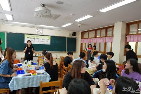 2019년 6월부터 만덕고에서 열리고 있는 만덕마을 배움나눔터 강좌(비누,가죽,도자기 공예)에 학생과 학부모, 지역 주민이 참여하고 있다(사진= 만덕고 학교협동조합 제공)