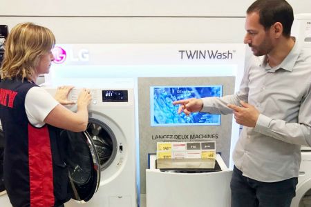 프랑스 최대 가전유통채널 '프낙 다르티(Fnac Darty)' 매장에서 직원들이 애프터서비스 지표 1위로 선정된 LG전자 세탁기를 소개하고 있다.(사진=LG전자 제공)