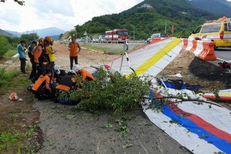 지난 23일 오후 2시쯤 경남 하동군 악양면 인근에서 행글라이더를 타고 상공을 날던 일행이 충돌해 도로 주변으로 추락했다.