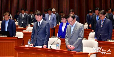 26일 오후 국회에서 열린 더불어민주당 의원총회에서 이해찬 대표, 이인영 원내대표 등 의원들이 백범 김구 선생을 추모하는 묵념을 하고 있다.