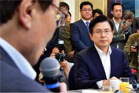 1일 국회 귀빈식당에서 열린 문희상 국회의장 주재 여야 5당 대표들의 초월회 오찬 간담회에서 자유한국당 황교안 대표가 더불어민주당 이해찬 대표의 발언을 바라보고 있다. 윤창원기자