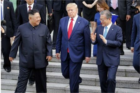 문재인 대통령과 김정은 북한 국무위원장, 도널드 트럼프 미국 대통령이 30일 판문점 남측 자유의 집에서 나오며 얘기를 나누고 있다. (사진=연합뉴스)