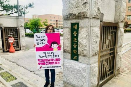 전교조 경기지부 소속 교사들은 지난 2~3일 이틀 동안 각급 학교 정문 앞에서 학교비정규직 노조의 총파업을 지지하는 1인 피켓 시위를 진행했다. (사진=전교조 경기지부 제공)