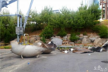 수소탱크 폭발로 떨어져 나간 잔해 일부가 검게 그을려 있다. (사진=유선희 기자)