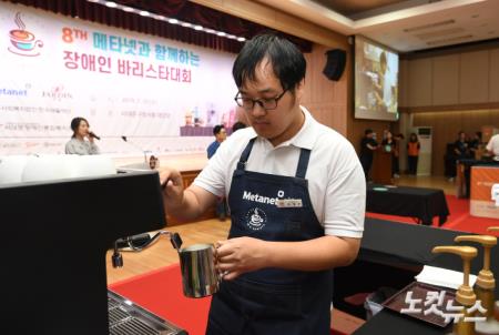 10일 서울 서대문구청에서 열린 제8회 메타넷과 함께하는 장애인 바리스타대회에서 한 참가자 라떼아트를 만들고 있다.