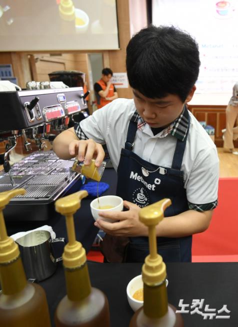 10일 서울 서대문구청에서 열린 제8회 메타넷과 함께하는 장애인 바리스타대회에서 한 참가자 라떼아트를 만들고 있다.