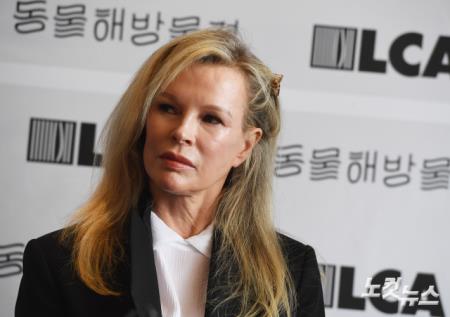 할리우드 배우 킴 베이싱어가 11일 오전 서울 중구 플라자호텔에서 ‘동물보호법 일부개정법률안 (동물 임의도살 금지법)’ 심사 및 통과 촉구를 위한 공동 기자회견에 참석해 취재진의 질문을 듣고 있다.