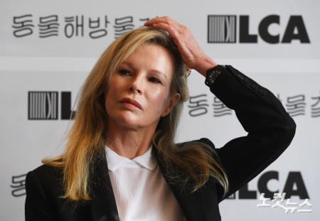 할리우드 배우 킴 베이싱어가 11일 오전 서울 중구 플라자호텔에서 ‘동물보호법 일부개정법률안 (동물 임의도살 금지법)’ 심사 및 통과 촉구를 위한 공동 기자회견에 참석해 취재진의 질문을 듣고 있다.