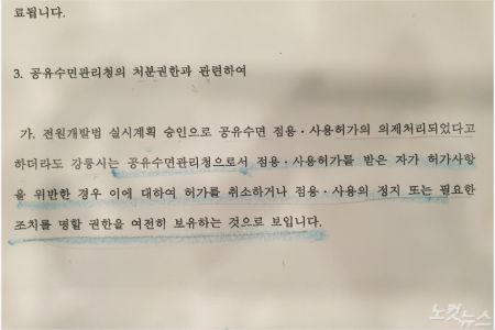 강릉시가 받은 내용을 보면 "강릉시는 공유수면관리청으로서 점용·사용허가를 받은 자가 허가사항을 위반할 경우 허가를 취소하거나 정지할 수 있는 권한을 여전히 보유하고 것으로 보인다"고 적시돼 있다. 다시 말해 산자부에 의해 공유슈면 점용·사용허가가 의제(일체의 허가권)처리됐다 하더라도 강릉시가 관리감독을 할 권한이 있다는 것이다.