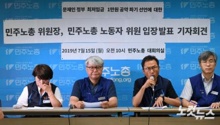 문 정부 최저임금 1만원 공약 파기 선언에 대한 입장 발표하는 김명환 위원장