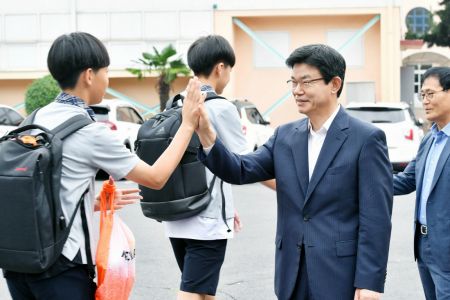 이석문 교육감이 지난 1일 취임 1주년을 맞아 아침등교시간에 서귀포중학교 학생들과 하이파이브 행사를 진행했다.(사진=제주도교육청 제공)