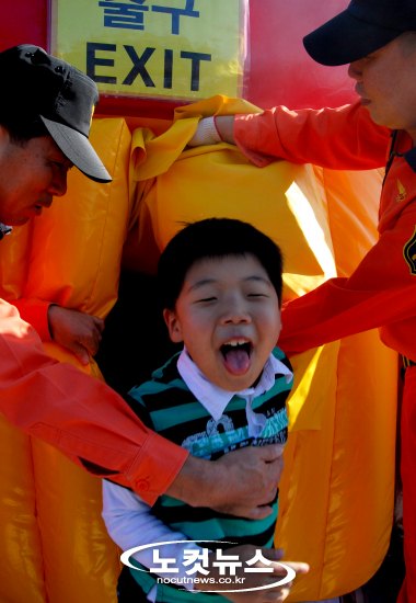 13일 오전 제주소방서 연동 119센터가 처음 선보인 ''연기속 미로 탈출 체험''장비에서 한 어린이가 탈출구로 나오고 있다. 연기체험 미로 탈출 장비는 가로 12m, 세로 6m 높이 2m의 버스 모형에 내부가 미로식 연기터널로 구성돼 있는 화재 체험장비로 버스 안에는 화재를 가상해 연기로 앞을 볼 수 없다. 이날 150여명의 어린이들은 버스 내부에서 연기를 뚫고 벽을 따라 출구로 혼자 나오는 화재 탈출 체험을 했다.