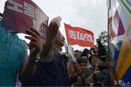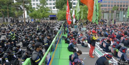 이들은 "해고는 살인이다, 정부는 책임져라" "직접고용 쟁취하고 투쟁 승리하자"며 구호를 합창하는 한편 경찰에 "당장 철수하라"고 외쳤다.