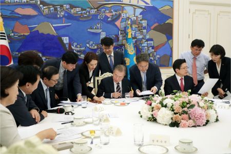 문재인 대통령과 여야 5당 대표, 각 당 대변인들이 18일 오후 청와대에서 회담 후 합의문에 대해 논의하고 있다. (사진=연합뉴스)