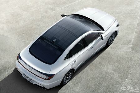 솔라루프를 얹은 신형 쏘나타 하이브리드. 태양 에너지를 저장하는 솔라루프는 주행거리를 늘리고 배터리 방전을 막는다.