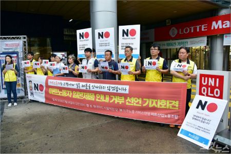 민주노총 서비스연맹 마트산업노동조합은 이날 롯데마트 서울역점 앞에서 일본 제품 안내를 거부를 선언하는 기자회견을 열었다.