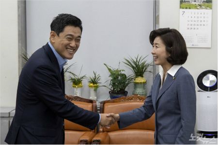 나경원 자유한국당 원내대표와 오신환 바른미래당 원내대표가 26일 국회 자유한국당 원내대표실에서 만나 인사를 나누고 있다. (사진=윤창원 기자)