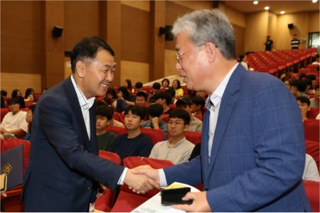 민주평화당 유성엽 원내대표(오른쪽)와 바른미래당 김관영 의원이 26일 오전 국회에서 열린 '전국 초중고 학생 학교폭력근절 토론회'에서 만나 악수하고 있다. (사진=연합뉴스)