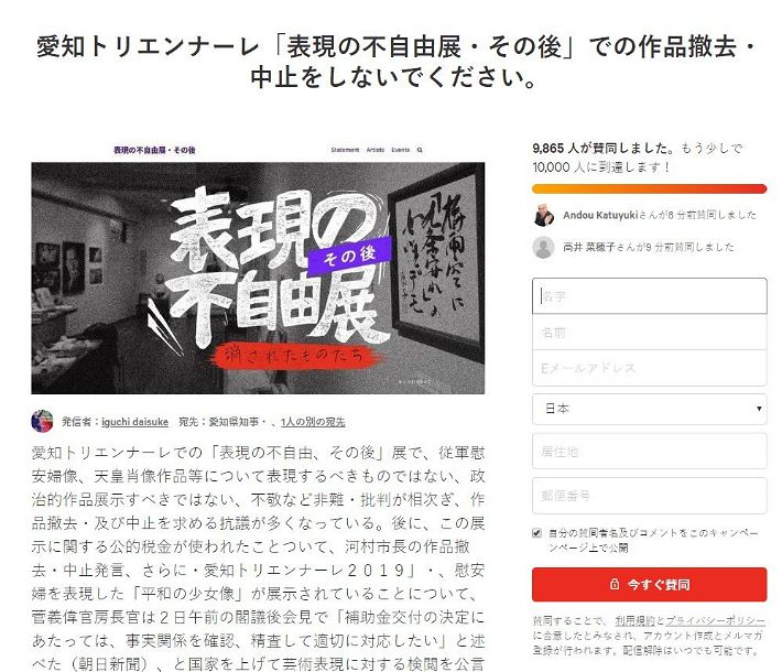 청원글을 올린 이구치 다이스케는 "모든 예술 표현에 대한 국가의 규제와 검열로 받아들일 수 있는 엉뚱한 움직임을 정치인들이 하고 있다"라면서 "우리는 예술 표현을 특정한 가치와 시각으로 보는 것이 아니라 다양한 시각에서 이해하고 생각한다"라고 말했다.