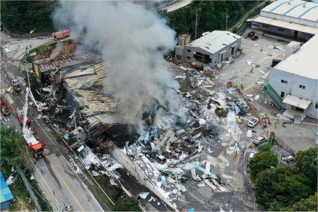 6일 오후 안성시 양성면의 종이상자 제조공장에서 원인 모를 폭발에 의한 것으로 추정되는 불이나 소방대원들이 진화작업을 하고 있다. 이 불로 안성소방서 소속 소방관 1명 사망하고, 1명이 다쳤다. (사진=연합뉴스)