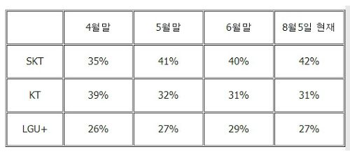 KT와 LG유플러스는 점유율 격차가 4월말 13%포인트에서 6월말 2%포인트로 좁혀진 뒤 최근 4%포인트로 약간 벌어지는 등 치열한 경쟁을 지속하고 있다.