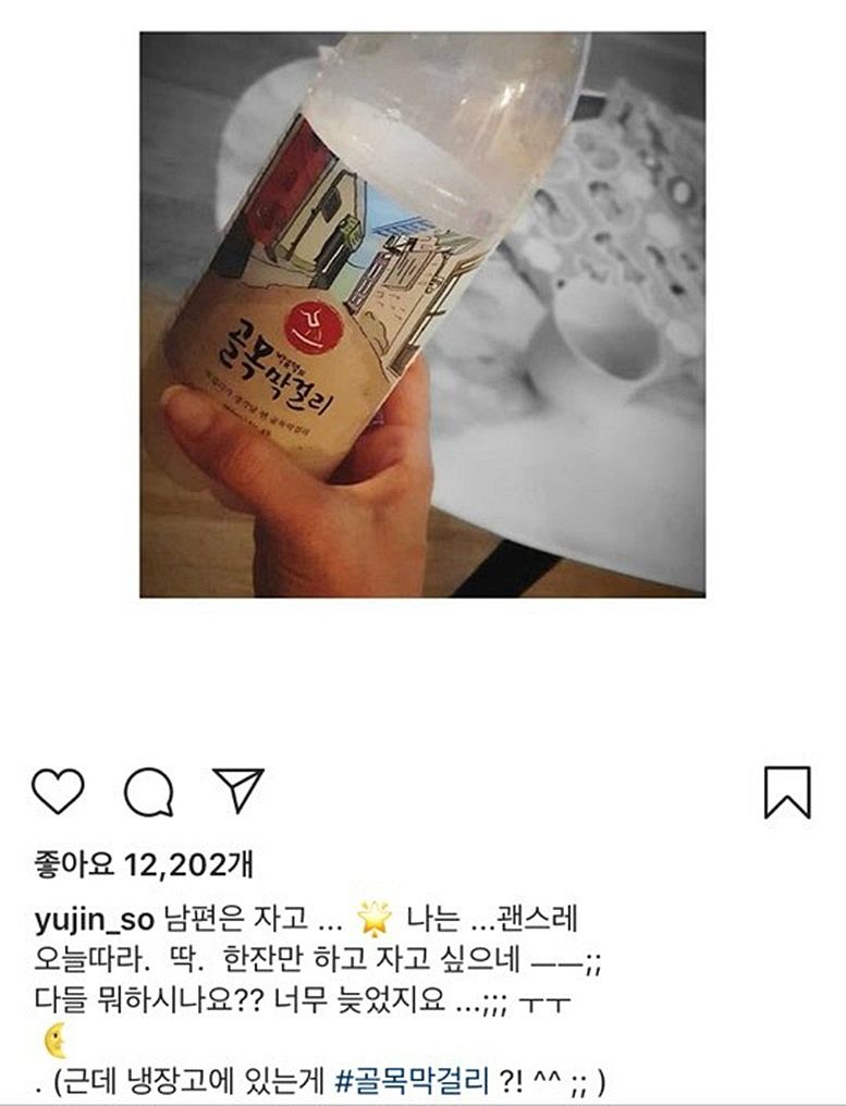 이후 새롭게 올라온 글에는 "남편은 자고, 나는 괜스레 오늘따라 딱 한잔만 하고 싶다"라고 막걸리 사진을 올렸다.