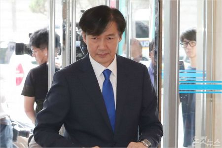 법무부 장관 후보자 조국 전 청와대 민정수석이 9일 오후 인사청문회 준비 사무실이 마련된 서울 종로구 적선동 현대빌딩에 출근하고 있다. 이한형기자