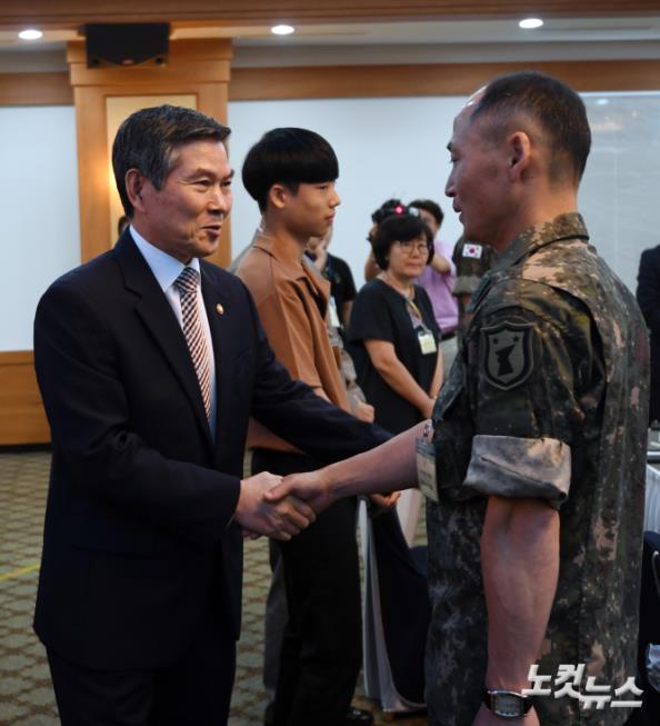 정경두 국방부장관이 19일 오전 서울 용산구 육군회관에서 열린 임무수행 유공장병 가족초청 행사에서 조은누리 양 구조 박상진 원사(진)와 악수를 하고 있다.
