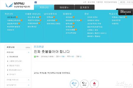 부산대 온란인 커뮤니티에 조국 후보 딸을 둘러싼 논란에 촛불집회를 제안하는 글이 잇달아 게시되고 있다.<부산대 학생 커뮤니티 '마이누피' 캡쳐>부산대>