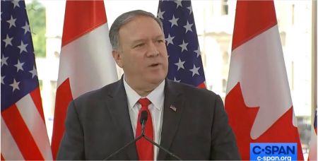 마이크 폼페이오 미 국무장관이 22일(현지시간) 캐나다 오타와에서 프리랜드 캐나다 외무장관과 공동기자회견을 열고 질문에 답하고 있다. (사진=C-span 영상 캡쳐)