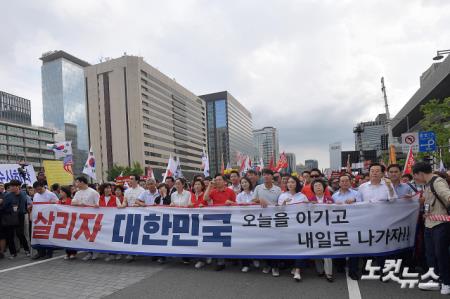 24일 서울 세종문화화관 앞에서 자유한국당 주최로 열린 '살리자 대한민국! 文정권 규탄 광화문 집회에서 황교안 대표, 나경원 원내대표를 비롯한 참가자들이 행진을 하고 있다.