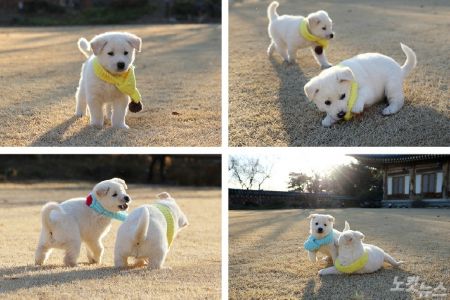 북한에서 온 풍산개 암컷 곰이와 수컷 송강이는 지난해 11월 대통령관저에서 6마리의 자견을 낳았는데, 이 가운데 두 마리가 대전에서 생활하게 된 것.