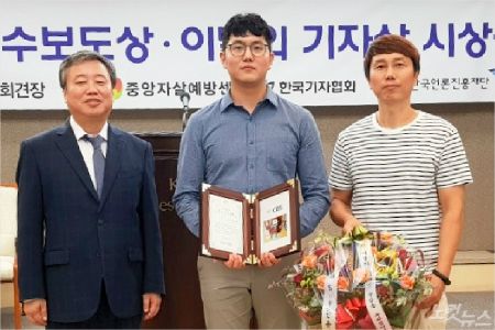 한국기자협회는 27일 서울 한국프레스센터에서 제347회 이달의 기자상 시상식을 갖고 제주CBS 고상현 기자의 ‘경찰 수사 체계 바꾼 고유정 부실수사’를 지역취재 부문 수상자로 선정하고 시상했다.(사진 왼쪽부터 한국기자협회 정규성 회장, 제주CBS 고상현 기자, 제주CBS 이인 부장)