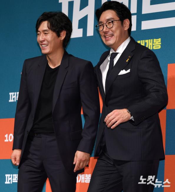 배우 설경구, 조진웅이 30일 오전 서울 강남구 CGV압구정점에서 열린 영화 '퍼펙트맨'(감독 용수)제작보고회에 참석해 포즈를 취하고 있다.