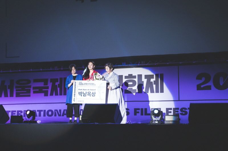 다큐멘터리 '어른이 되면'의 장혜영 감독(가운데)이 박남옥상을 수상했다. (사진=서울국제여성영화제 제공)