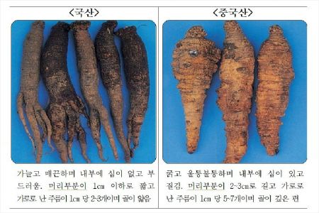 취나물의 경우 국산은 줄기가 가늘고 부드러우며 잎의 색이 연하면서 펴진 상태로 건조되어 모양이 뚜렷한 것이 특징이다. 중국산은 줄기가 굵고 딱딱하며 잎의 색이 진한 편이며, 둥글게 말린 상태로 건조되어 모양이 뚜렷하지 않다.