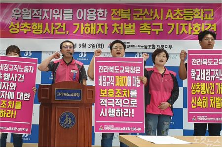 전국학교비정규직노동조합 전북지부가 3일 전라북도교육청에서 기자회견을 열고 "학교 비정규직 노동자들에게 성희롱과 성추행을 일삼은 교장을 신속히 처벌하라"고 촉구했다.