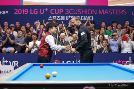조명우는 8일 경기도 스타필드 하남에서 열린 '2019 LG U+ 3쿠션 마스터스' 결승전에서 세미 세이그너를 40 대 16으로 제압했다. 경기 시작 약 55분, 17이닝 만에 완승을 거두고 우승컵과 함께 상금 8000만 원을 거머쥐었다.