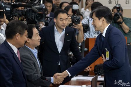 조국 법무부 장관 후보자가 6일 국회에서 열린 인사청문회에서 자유한국당 주광적 의원과 인사를 하고 있다. (사진=윤창원 기자/자료사진)