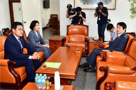 여야 3당(더불어민주당 이인영, 저유한국당 나경원, 바른미래당 오신환) 원내대표들이 9일 국회에서 회동을 갖고 있다. (사진=윤창원 기자)