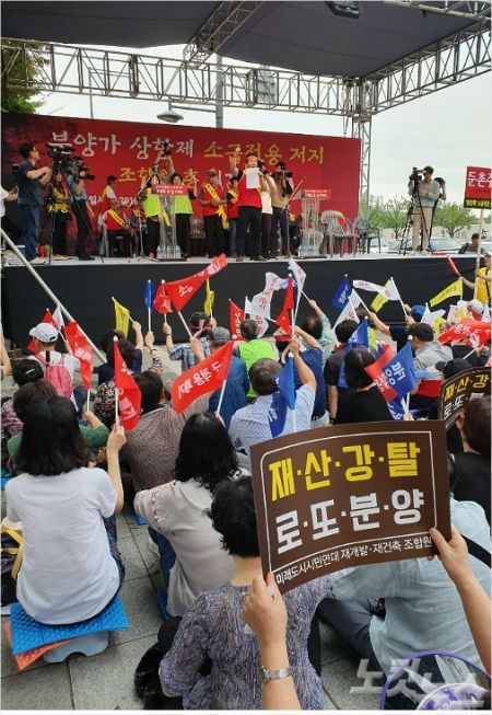 조합측은 "전체 주택물량의 1%에 불과한 재개발 재건축사업장으로는 국민의 주거안정을 이룰 수 없다"며 "헌법에 위배되는 소급적용을 즉각 폐기하고 공적자금을 투입해 주거안정을 해결하라"고 주장했다.