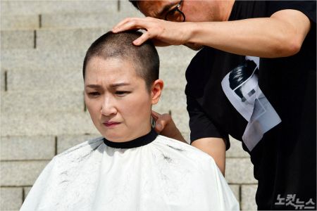 무소속 이언주 의원이 조국 법무부 장관 임명 강행에 항의하며 10일 오전 국회 본청 앞 계단에서 삭발식을 감행하고 있다.(사진=윤창원 기자)