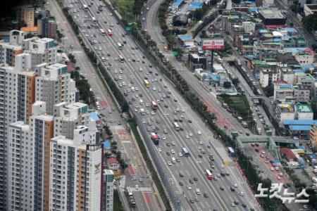 추석 연휴를 하루 앞둔 11일 오후 경기도 용인시 신갈IC 인근 경부고속도로에 차량들이 지나고 있다. [항공촬영 협조 : 서울지방경찰청 항공대 이용길 경감, 경기북부지방경찰청 경위 박형식]