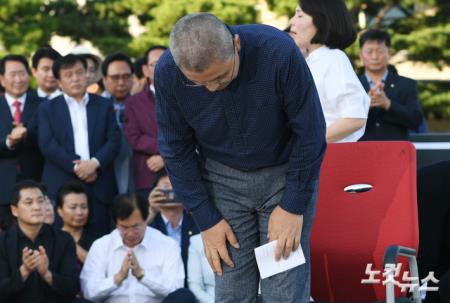 황교안 자유한국당 대표가 16일 오후 서울 종로구 청와대 앞 분수대 광장에서 조국 법무부 장관의 사퇴를 촉구하며 삭발을 마치고 인사를 하고 있다.