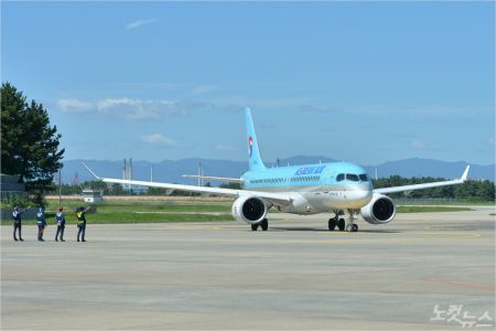 포항-제주 노선에 운항하는 대한항공 A220 항공기가 16일 포항공항에서 이륙 준비를 하고 있다.(사진=김대기 기자)